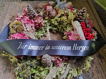 ndten, Freunden oder Bekannten gewählt. Auch hier werden Schleifenbänder eingebunden, auf denen eine letzte Botschaft an die verstorbene Person gedruckt ist.